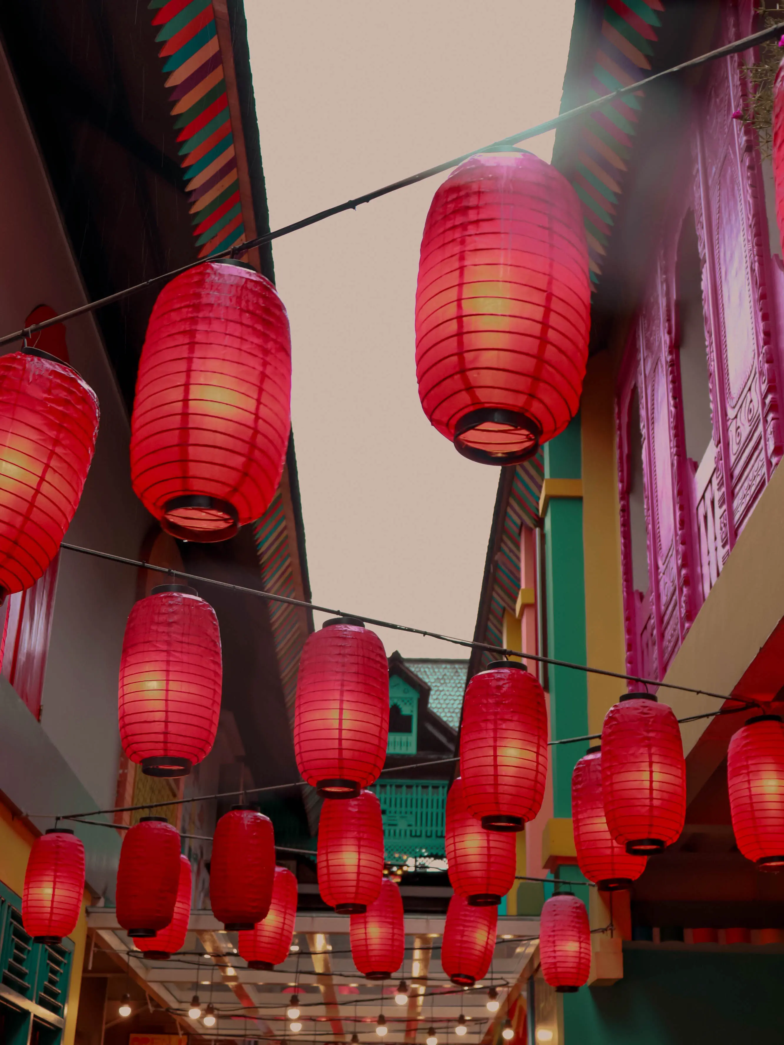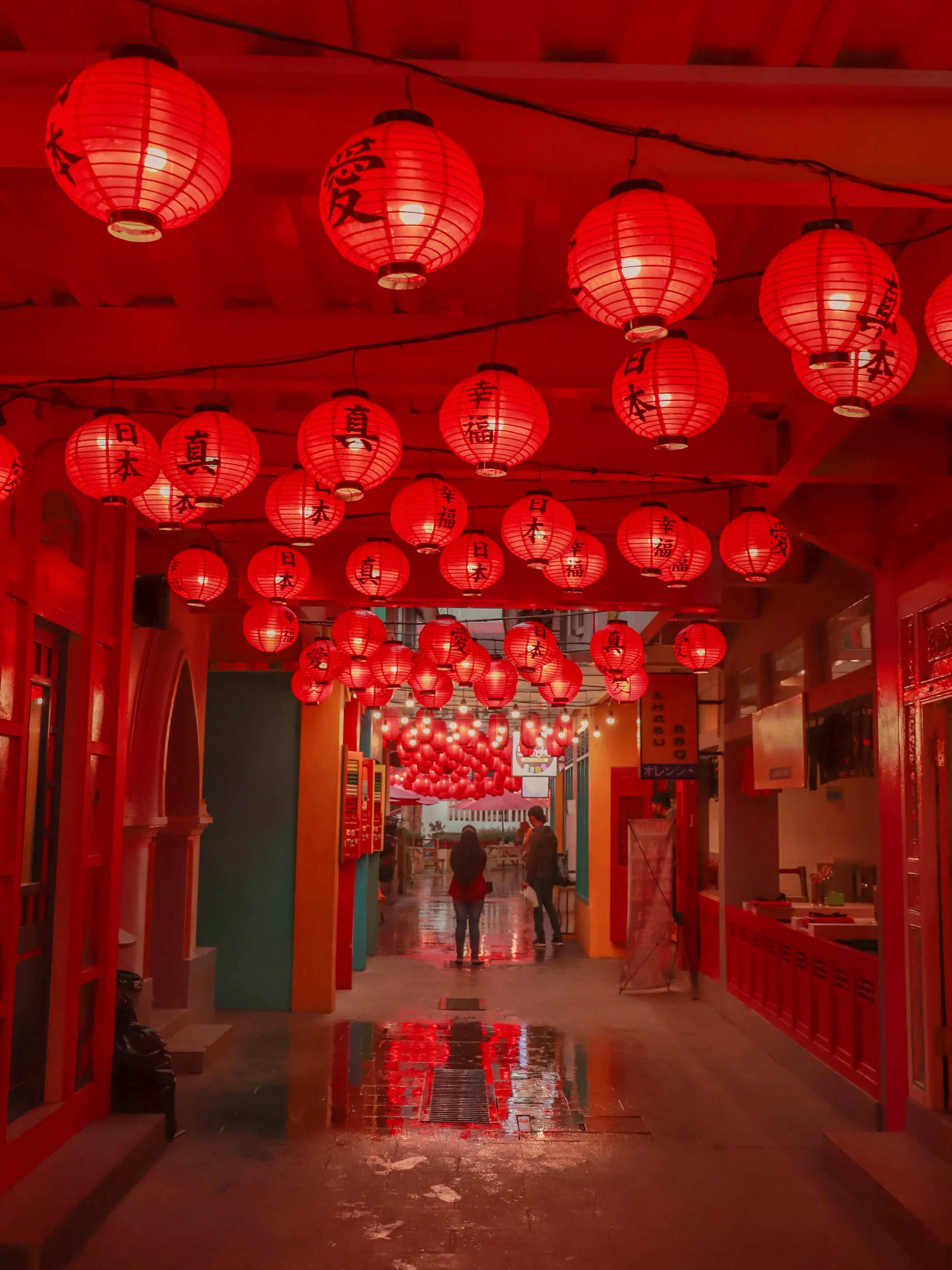 The lively ambiance of a Chinese landscape night market. Rows of colorful stalls are illuminated by a dazzling array of lanterns, casting a warm glow on the bustling scene.